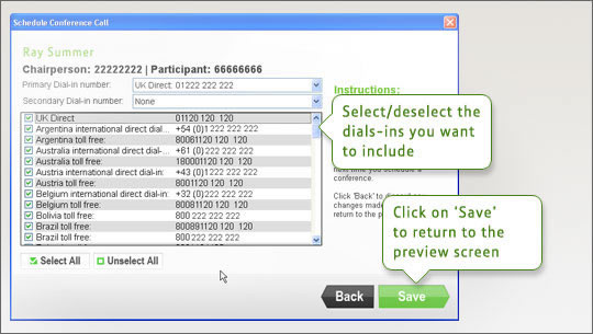 2. Check the dial-ins that you want to display in your invitation. Click Save.
